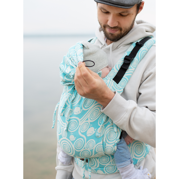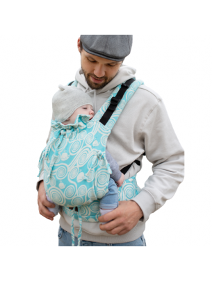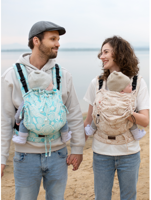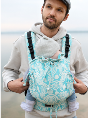 Die Babytrage hat zusätzliche Möglichkeit des Anlegens der Schnallen in der Nähe des Popos des Kinds, was zusätzlich das Becken einzieht und hilft, den Rücken bei kleinsten Kindern abzurunden und gibt ihrem Körper sichere, ergonomische Position. Das ist ideale Babytrage für ganze Periode des Tragens.