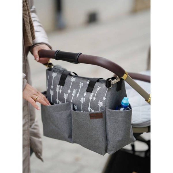 Um noch besseren Komfort der Nutzung zu sichern, kann man die Tasche an den Bügel des Kinderwagens mittels dedizierter Haken hängen. Sie besitzt auch langen ausknöpfbaren und regulierbaren Gürtel zum Tragen auf der Schulter und kleinere bequeme Henkel, die das Tragen in der Hand ermöglichen.