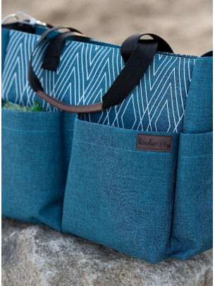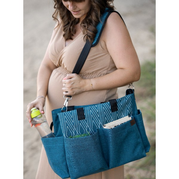 Um noch besseren Komfort der Nutzung zu sichern, kann man die Tasche an den Bügel des Kinderwagens mittels dedizierter Haken hängen. Sie besitzt auch langen ausknöpfbaren und regulierbaren Gürtel zum Tragen auf der Schulter und kleinere bequeme Henkel, die das Tragen in der Hand ermöglichen.