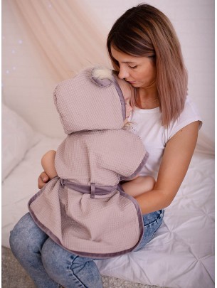 Das ist hervorragende Kombination des Badetuchs und des Schlafrocks. Es wird über den Kopf angezogen und sichert zusätzliche Wärme in der Gegend der Brust und erlaubt freies Spiel oder Laufen am Strand. Auf den Seiten wird das Poncho mit den Schnappverschlüssen verschlossen und besitzt den Riemen für das Binden in der Taille, wie im Schlafrock. Somit erlaubt es, ganzen Körper einzuhüllen und sichert noch mehr Wärme und Komfort.