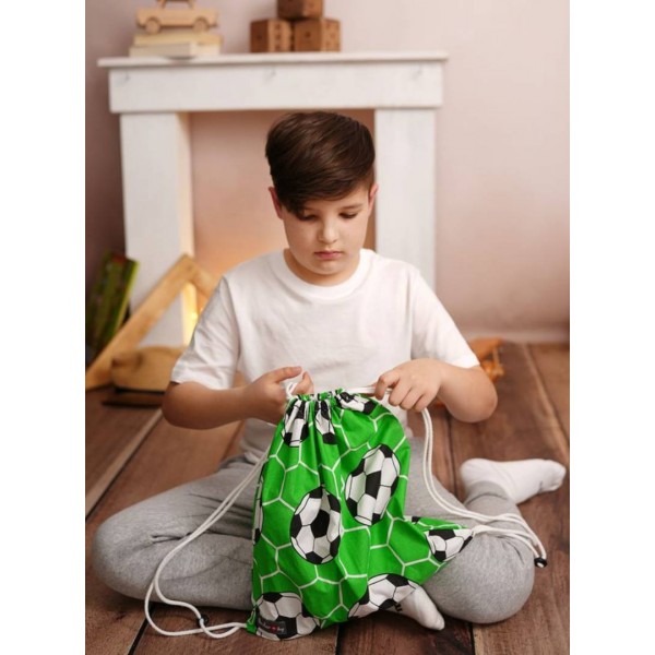 The cotton football bag is made of durable fabric and measures 37x38 cm to fit shoes and a football outfit or flip-flops and a swimming pool suit. Such sackpack is also useful on a walk. You can easily fit a large water bottle, snacks or a change of clothes for your little one.